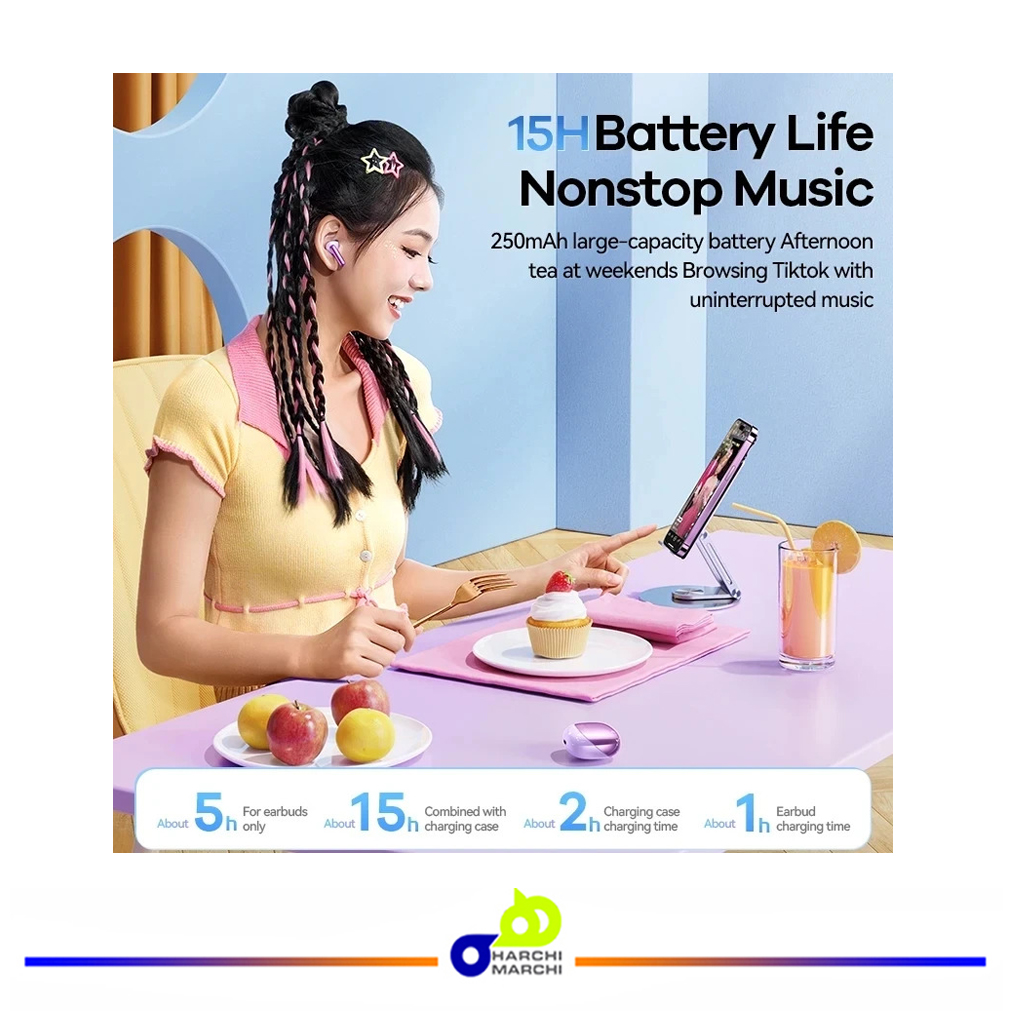در این مدل از آخرین نسخه بلوتوث 5.3 استفاده شده است که عملکردهای اتصال پایدارتر، مصرف برق کمتر، انتقال پایدارترو ضد تداخل قدرتمند را ارائه میدهد.گوشیهای چپ و راست به ترتیب دارای سیستم میکروفون دوگانه بوده که با حساسیت بالای داخلی می باشد و موجب ارائه یک صدای واضح و بدون نویز برای مخاطب میشود .