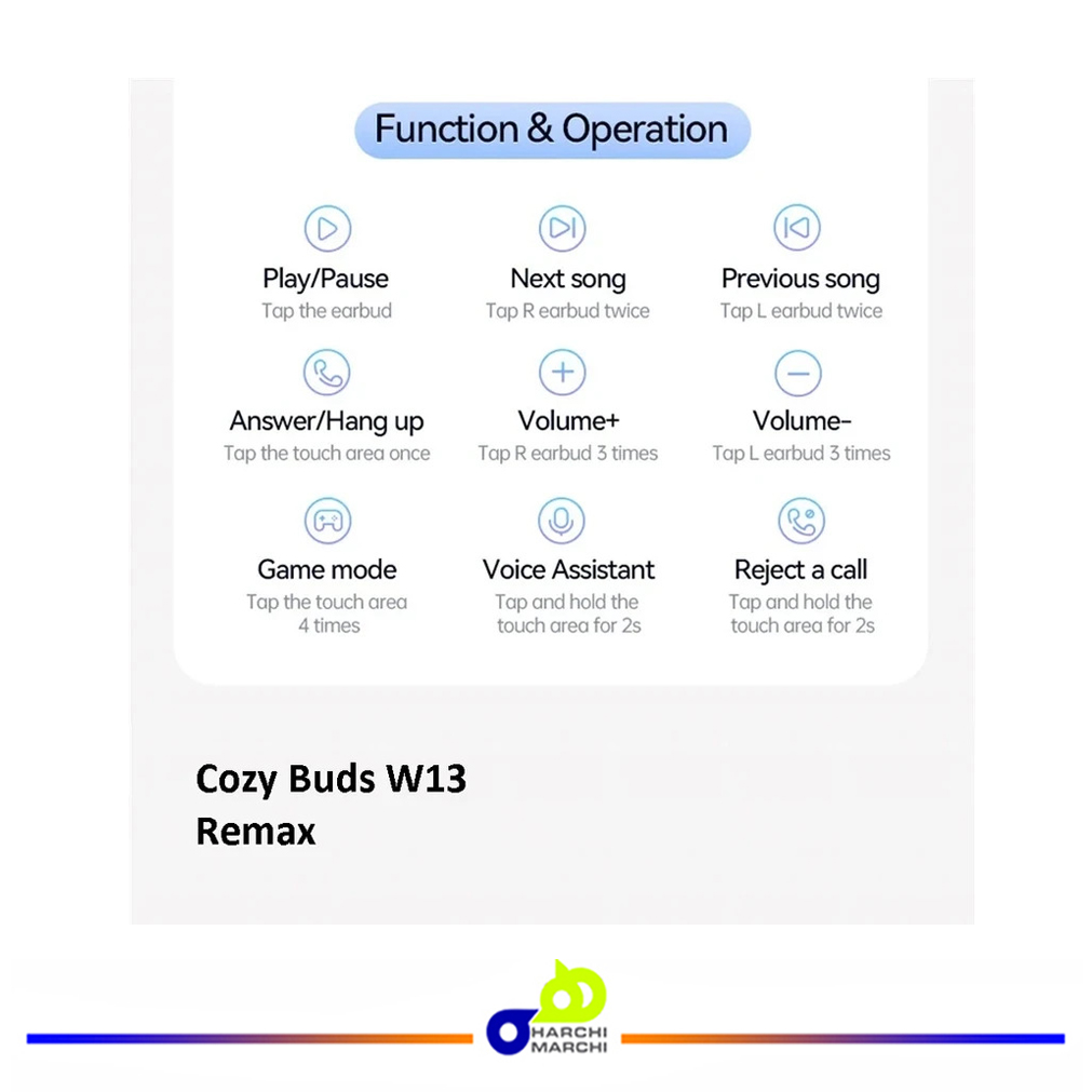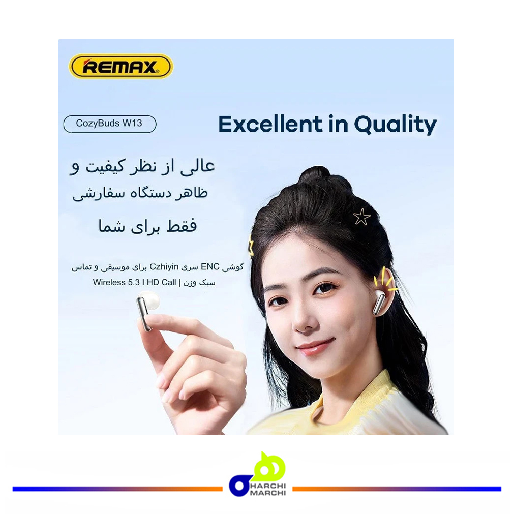 برند ریمکس از برند های معروف و پر آوازه در عرصه تولید انواع لوازم جانبی در جهان است.این کمپانی در تولیدات خود کیفیت و زیبایی را در اولویت قرار داده است و توانسته است طرفدارن بیشماری را درسطح دنیا برای خود کسب کند.هدست بلوتوثی ریمکس مدل Cozy Buds W13 ،یکی از زیباترین ایرپادهای طراحی شده این شرکت برای مکالمه و پخش موزیک و دیگر کاربریهاست.